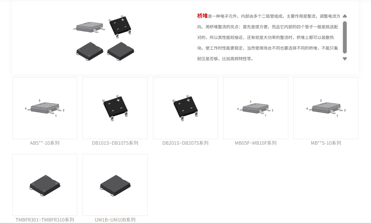 桥堆是一种电子元件,内部由多个二极管组成。主要作用是整流,调整电流方向。用桥堆整流的优点:首先是很方便,而且它内部的四个管子一般是挑选配对的,所以其性能较接近,还有就是大功率的整流时,桥堆上都可以装散热块。使工作时性能更稳定,当然使用场合不同也要选择不同的桥堆,不能只看耐压是否够,比如高频特性等。