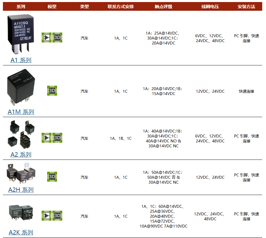 ● A1 系列的开关容量高达 30A,适用于汽车和车灯配件。安装方法为 PC 引脚或快速连接。触点排列选项为 1A 或 1C,线圈功率选项为 1.2W 或 1.5W。A1 系列尺寸为 22.8 x 15.3 x 25.8 毫米。