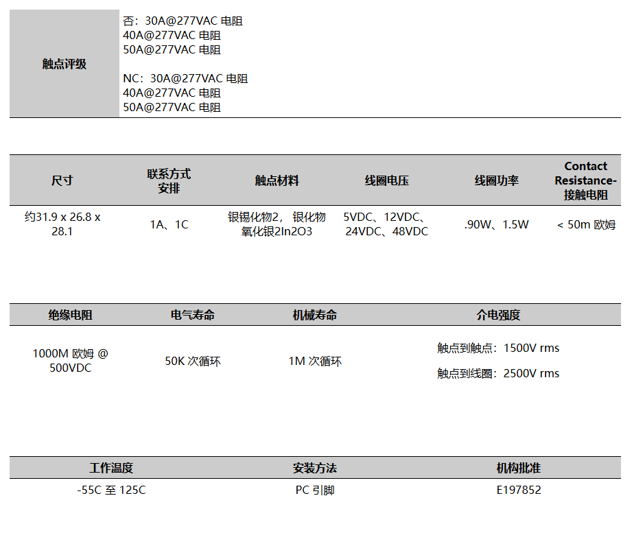 锁定继电器 F级绝缘 标准轻质和小尺寸 重接触负载 强大的冲击和振动阻力 UL/cUL和TUV认证