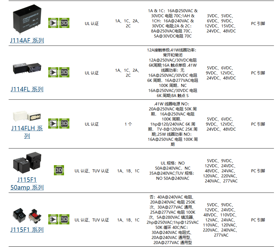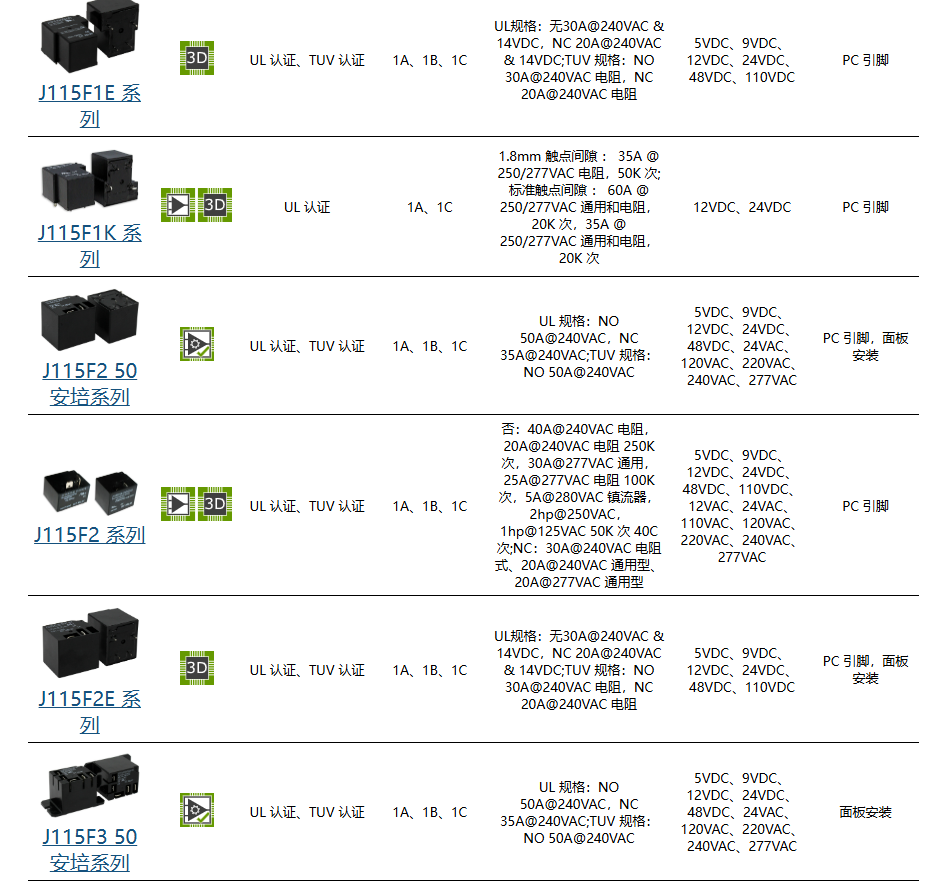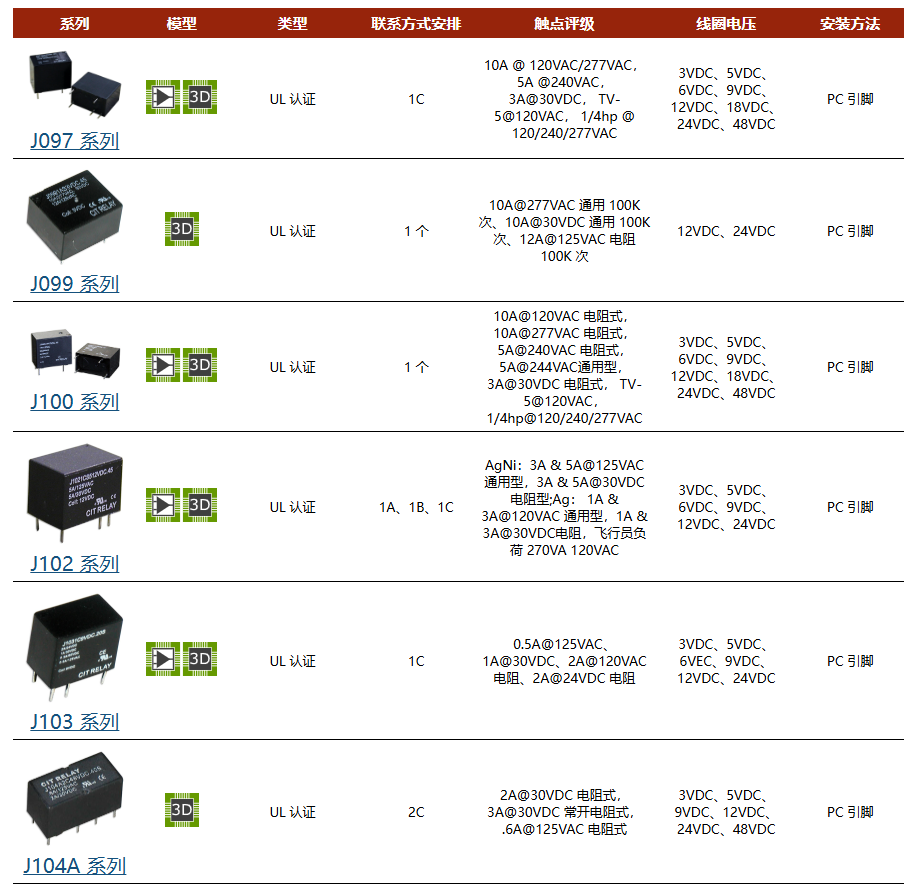 开关容量高达10A,体积小,重量轻,线圈功耗低,接触负载高