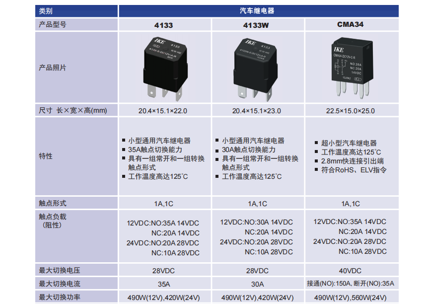 汽车继电器 4133 特性: ■小型通用汽车继电器 ■35A触点切换能力 ■具有一组常开和一组转换触点形式 ■工作温度高达125℃